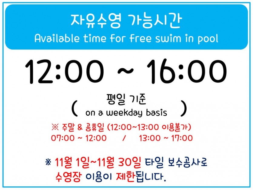 11월 수영장 타일보수공사로 인하여 1달간 (11/1~11/30) 운영하지 않습니다.