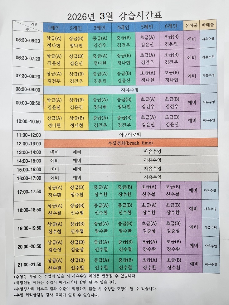 26년 3월 수영강습 시간표