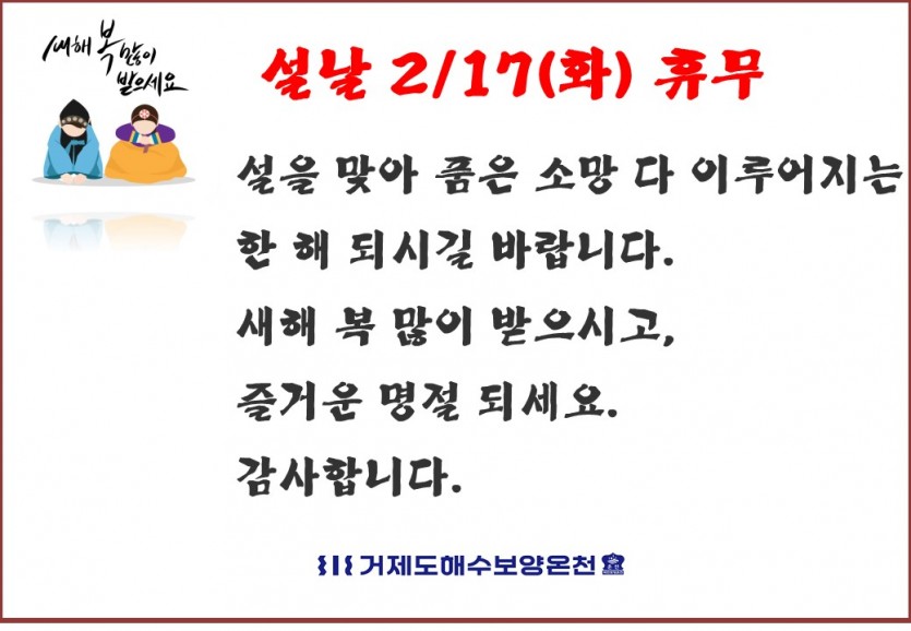 설날(2/17 화)연휴 안내 페이지 정보 작성자 거제도해수보양온천 댓글 0건 조회 73회 작성일 26-02-12 13:33 본문 감사합니다. 목록 다음글수영강습 등록 공지 26.02.03 댓글목록 댓글목록 등록된 댓글이 없습니다.